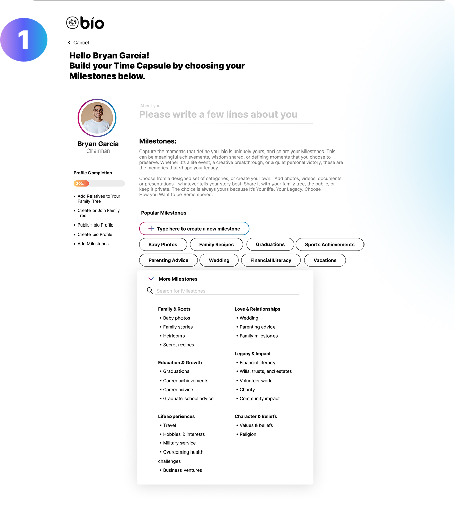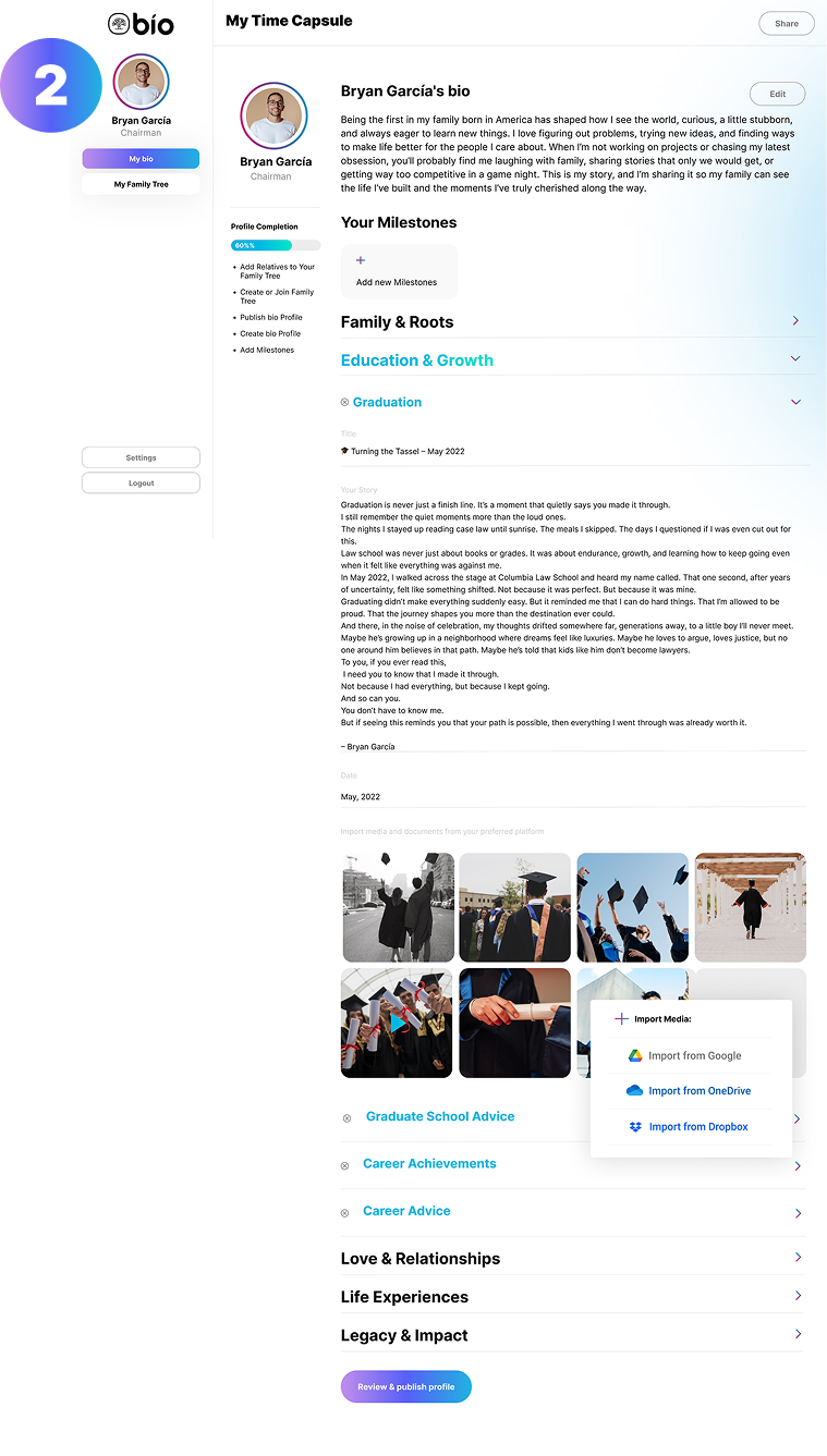 Create a time capsule of your life with bio. Choose from meaningful categories called Milestones to upload photos, videos, and even presentations capturing the moments, memories, and stories that define you.