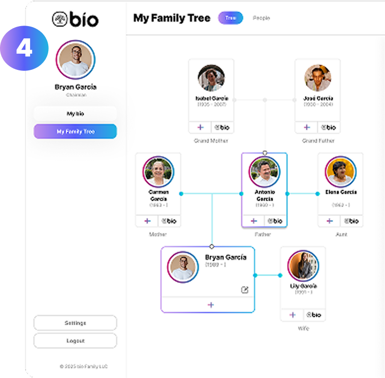 To create a family tree, you can start from scratch or connect your bio profile to a tree already created by relatives.